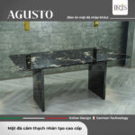 Bàn ăn có mặt đá cẩm thạch nhân tạo Agusto nổi bật với tông màu đen chủ đạo kết hợp cùng các đường vân trắng tự nhiên, tạo nên vẻ đẹp sang trọng và hiện đại cho toàn bộ phòng ăn. Mặt bàn được mài bóng láng mịn, phản chiếu ánh sáng nhẹ nhàng, càng làm nổi bật nét đẹp tinh tế của đá.